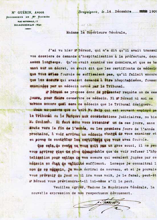 Suite aux lois anticongreganistes Combes du début du 20° siècle, si la communauté des Clarisses ne fut pas expulsée, contrairement à d'autres communautés religieuses installées à Lorgues ( expulsion des frères de St Gabriel du pensionnat St Louis de Gonzague, des Ursulines, fermeture de l'école des soeurs Saint-Thomas de Villeneuve... ), elle dut subir de sérieux désagréments. Les soeurs âgées et malades étaient autorisées à rester dans le couvent, propriété de la municipalité, pour être hospitalisées sur place et les plus jeunes pouvaient rester pour les soigner. Ces autorisations étaient soumises à conditions et devaient suivre une procédure administrative comme l'explique l'avoué, conseil des soeurs, dans le courrier ci-dessous. |